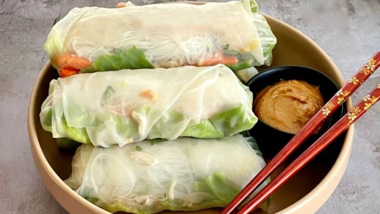 Crispy on the outside and packed with juicy chicken and fresh vegetables inside such as rice vermicelli, chicken, and more, these spring rolls are served with a rich and creamy peanut sauce for dipping. They make a delightful appetizer or light meal that's bursting with flavor and texture.