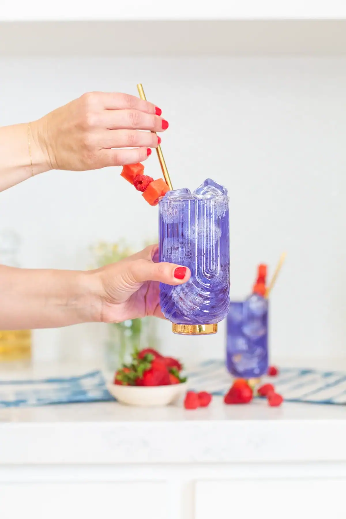 This Firecracker Margarita blends tangy and sweet flavors with bold patriotic colors. The vibrant blue drink pairs perfectly with a bright red rim for a striking, festive look. Firecracker Margarita